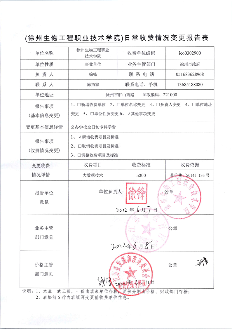 徐州生物工程职业技术学院日常收费情况变更报告表2022-06